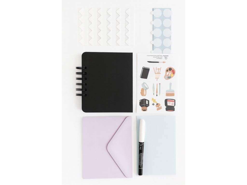 - Obsah: deník k dotvoření ve formátu A5, 5x barevné A5, růžky na fotky, oboustranná lepící kolečka, arch samolepek A6, obálka na nezbytnosti